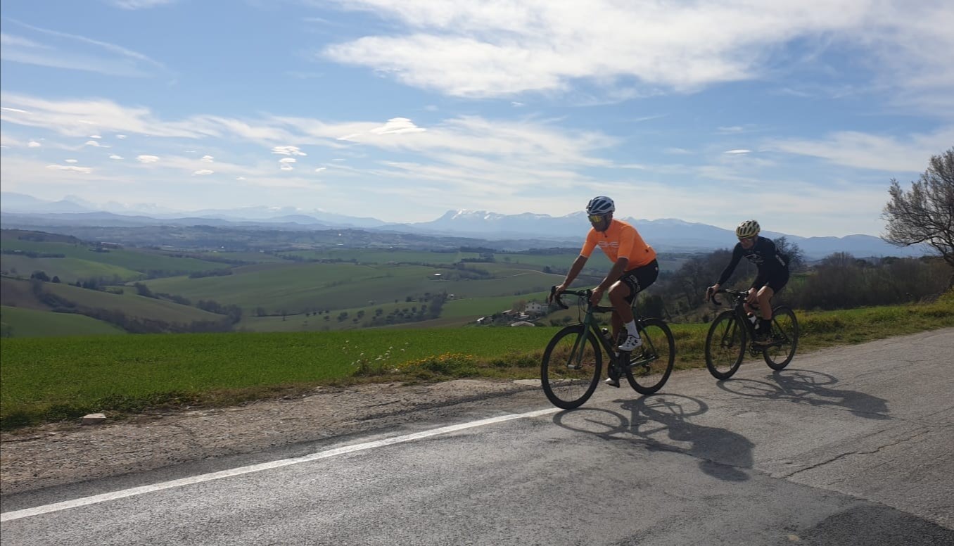 Il nostro percorso si conclude pedalando lungo un’ultima ripida discesa che ci riporta alla chiesa di San Claudio al Chienti da cui eravamo partiti, mentre ci lasciamo alle spalle le linee morbide del paesaggio collinare maceratese.