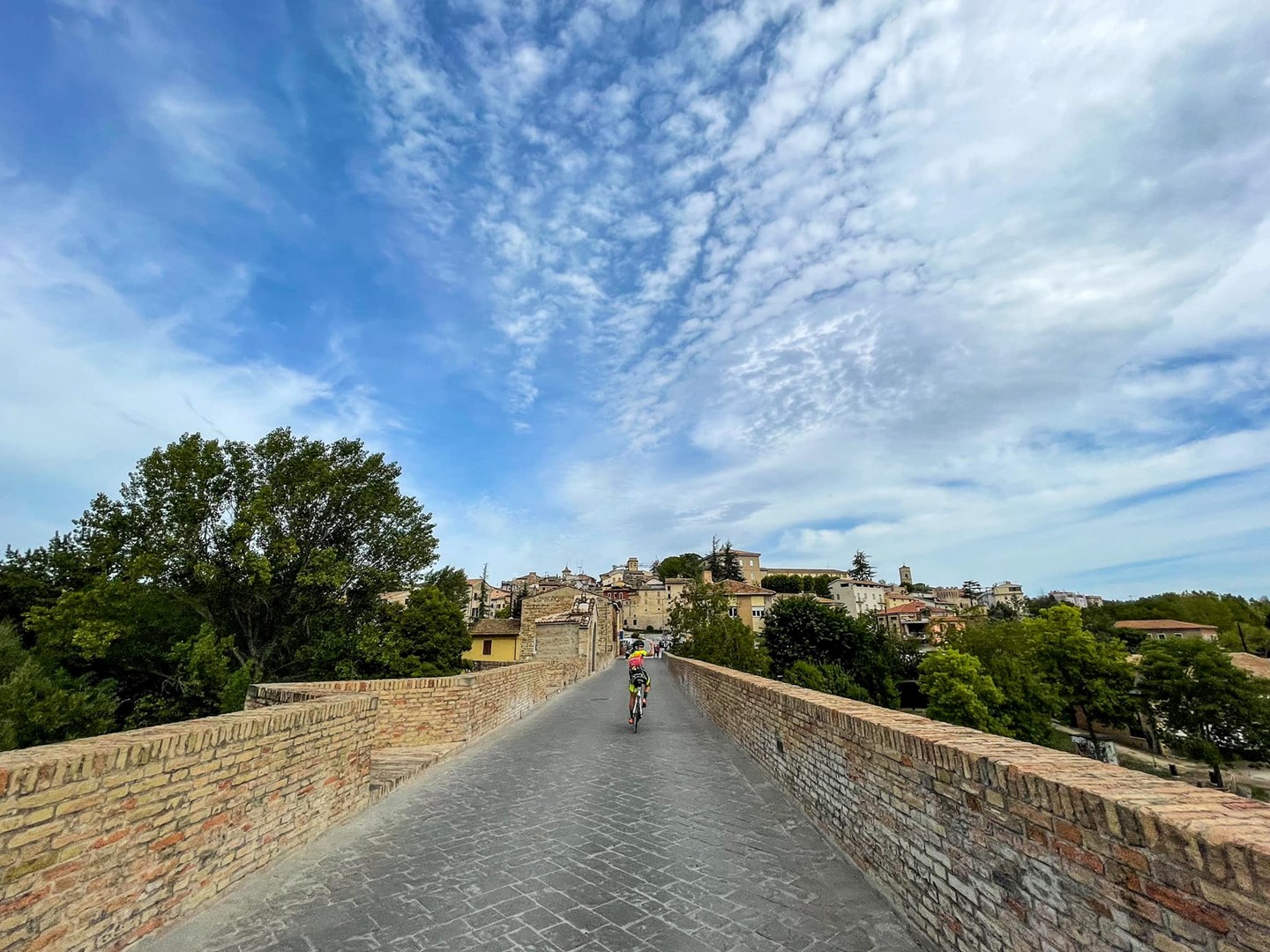 Lasciamo Urbisaglia per pedalare fino al punto più alto del nostro tracciato e poi ridiscendere fino a Tolentino, città natale del Santo Nicola vissuto nella seconda metà del Duecento. A lui è intitolata la basilica che si trova nel centro storico, inoltre la sua figura è legata a una leggenda che racconta le origini del Ponte del Diavolo, costruzione del 1268 unica nella sua forma per tutto il corso del fiume Chienti. Secondo la leggenda il Mastro incaricato della costruzione incontrò diverse difficoltà, tanto da avvalersi della magia nera per la realizzazione: sembra che il ponte venne costruito in una sola notte con l’aiuto del diavolo, ma che in cambio egli chiese l’anima del primo essere umano che lo avesse attraversato; grazie a un astuto stratagemma di San Nicola il primo a passare sul ponte fu un cagnolino, il diavolo lo catturò e fu così beffato.